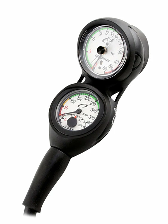 The Oceanic Swivel Combo Gauges gives you a submersible pressure gauge for your air reading as well as depth gauge. The bright white faces make them easy to read underwater and glow under torchlight in the dark.Â