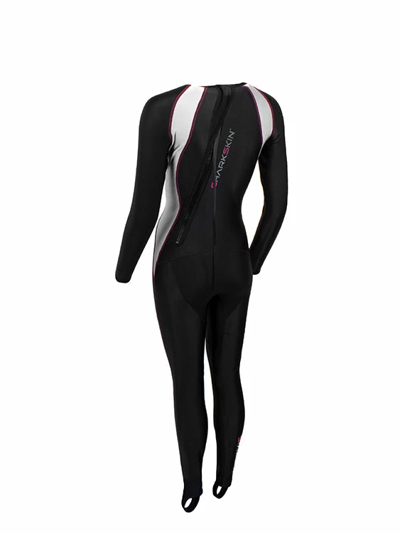 The Sharkskin Chillproof 1 Piece suit has a female cut and a backzip. It provides the equivalent warmth of a 2.5 to 3 mm wetsuit while consisting of a thinner, fleece-like material that’s less buoyant. The Sharkskin Chillproof 1 Piece Suit keeps the wind chill out and the material keeps you safe from UV ray.