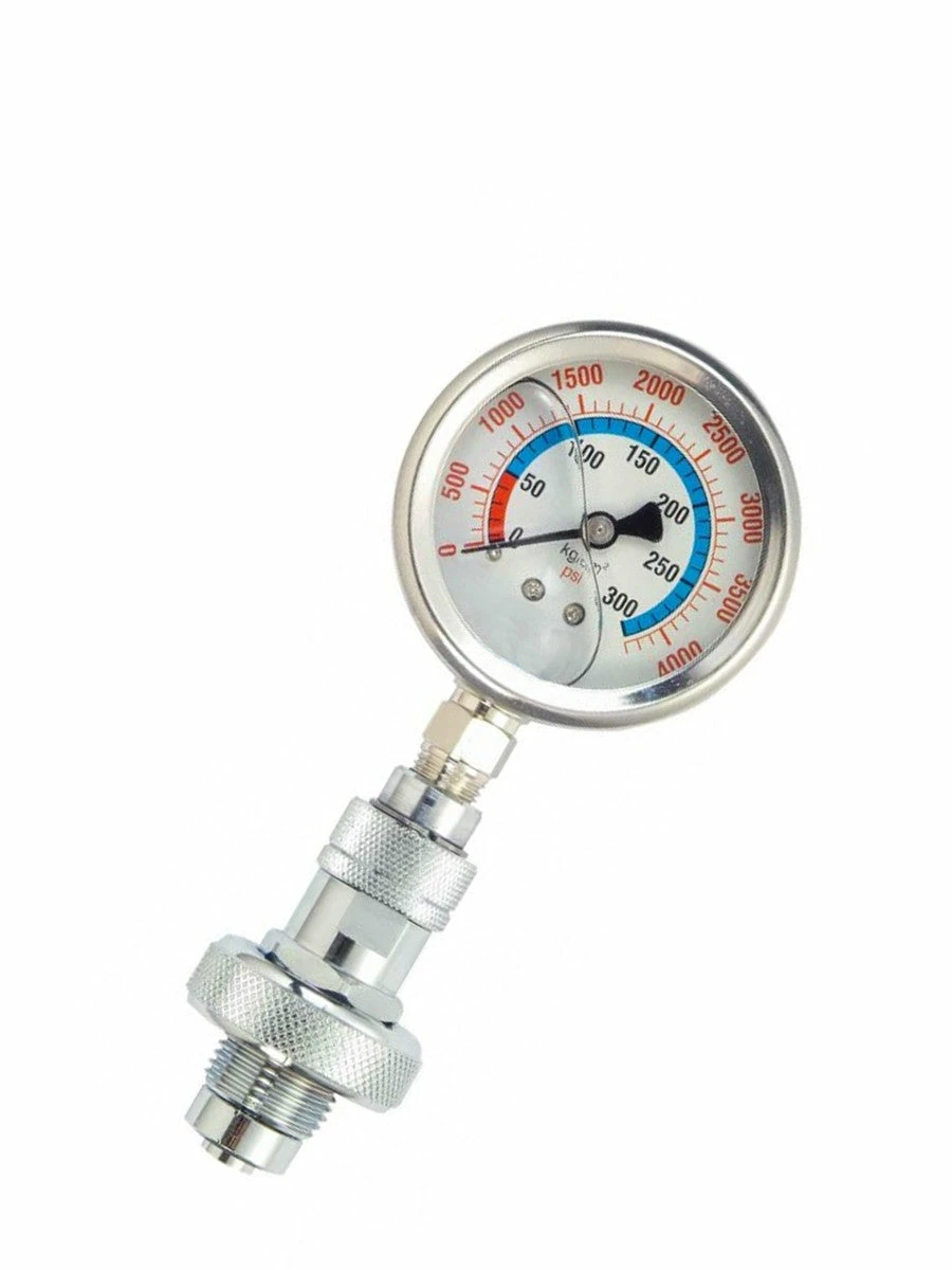 Check your tank pressure (in PSI or BAR) at any time with this heavy duty tank pressure checker. To ensure durability and accuracy the gauge is oild filled. Comes with a DIN (G 5/8) connection (combine with a DIN to Yoke converter to have a pressure checker for both DIN and Yoke cylinders).