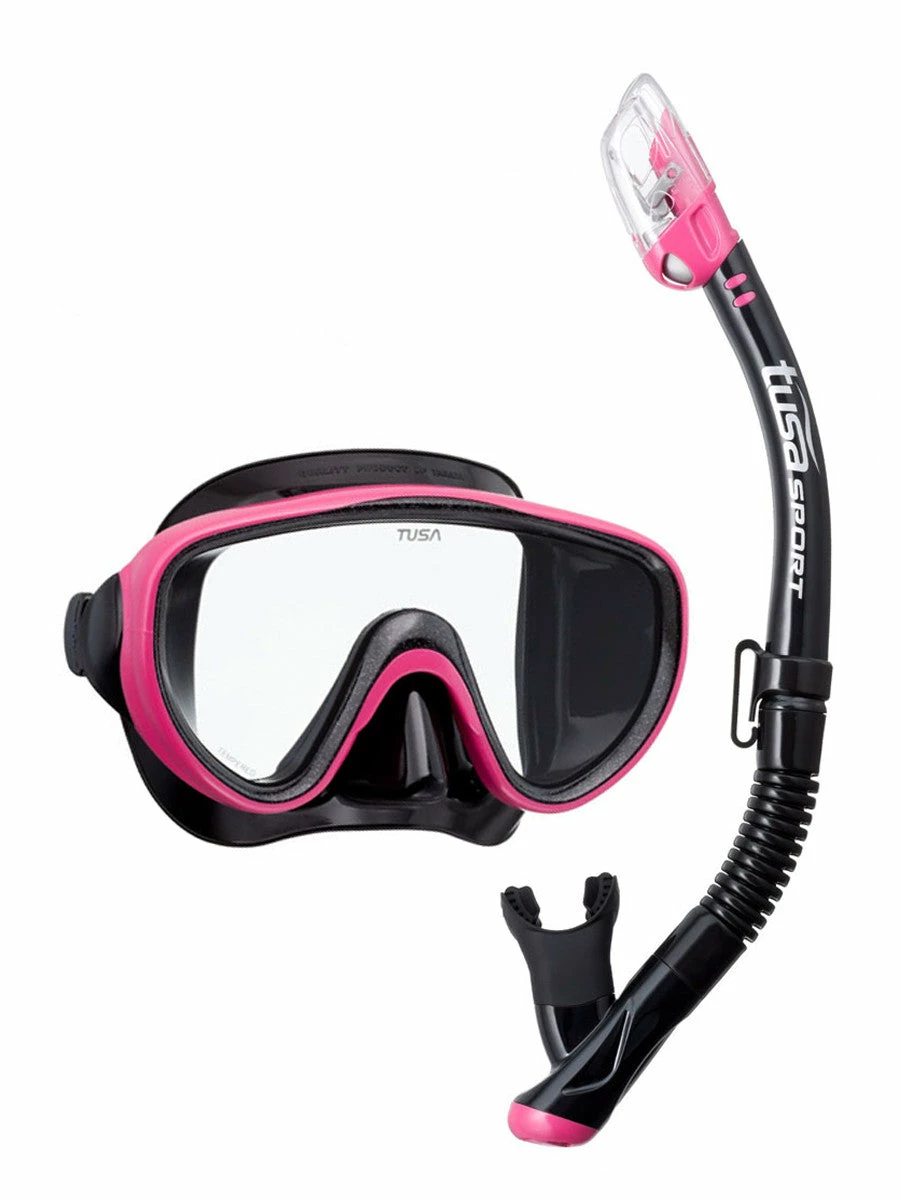 The TUSA Sport Serene adult snorkelling combo (UC-1626) in metallic hot pink, consists of a TUSA Sport Serene Mask (UM-16QB) and a TUSA Sport Hyperdry Elite Dry Top Snorkel (USP-250QB).